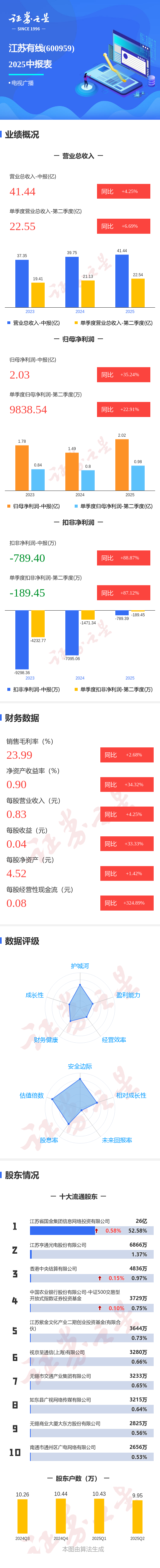 证券之星音信,江苏有线2025年中报清晰,公司主营收入41.44亿元,同比高潮4.25%;归母净利润2.03亿元,同比高潮35.24%;扣非净利润-789.4万元,同比高潮88.87%;其中2025年第二季度,公司单季度主营收入22.55亿元,同比高潮6.7%;单季度归母净利润9838.54万元,同比高潮22.91%;单季度扣非净利润-189.45万元,同比高潮87.12%;欠债率37.45%,投资收益1.44亿元,财务用度-858.35万元,毛利率23.99%。